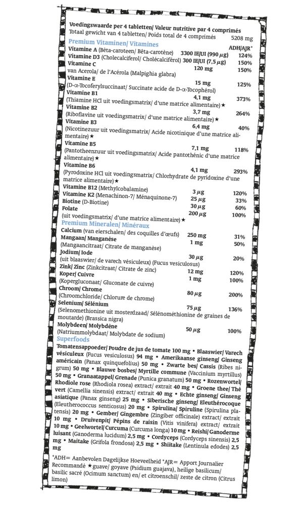 Royal Green Multi Man levert essentiële vitaminen en mineralen die een man nodig heeft in de vorm van voeding. Zo komt onze vitamine C uit acerola bessen, verschillende B-vitaminen uit een unieke mix van guave, holy basil en citroenschil en komt onze selenium uit mosterdzaad. We leveren hiernaast maar liefst 18 verschillende superfoods, waaronder amerikaanse ginseng, aziatische ginseng, siberische ginseng, geelwortel, gember, groene thee, rhodiola, reishi, cordyceps en nog veel meer! Uiteraard verbouwd zonder het gebruik van bestrijdingsmiddelen.
