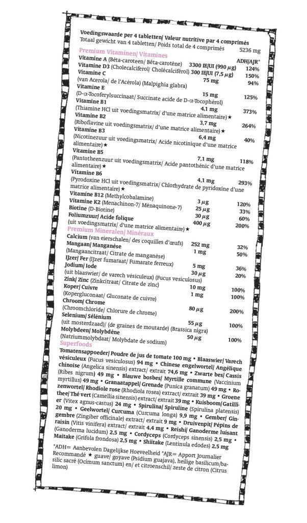 Royal Green Multi Woman levert essentiële vitaminen en mineralen die een vrouw nodig heeft in de vorm van voeding. Zo komt onze vitamine C uit acerola bessen, verschillende B-vitaminen uit een unieke mix van guave, holy basil en citroenschil en komt onze selenium uit mosterdzaad. We leveren hiernaast maar liefst 17 verschillende superfoods, waaronder dong quai (Chinese engelwortel), kuisboom (monnikenpeper), rhodiola, geelwortel, gember, zwarte bessen, spirulina, granaatappel, reishi en nog veel meer! Uiteraard verbouwd zonder het gebruik van bestrijdingsmiddelen.